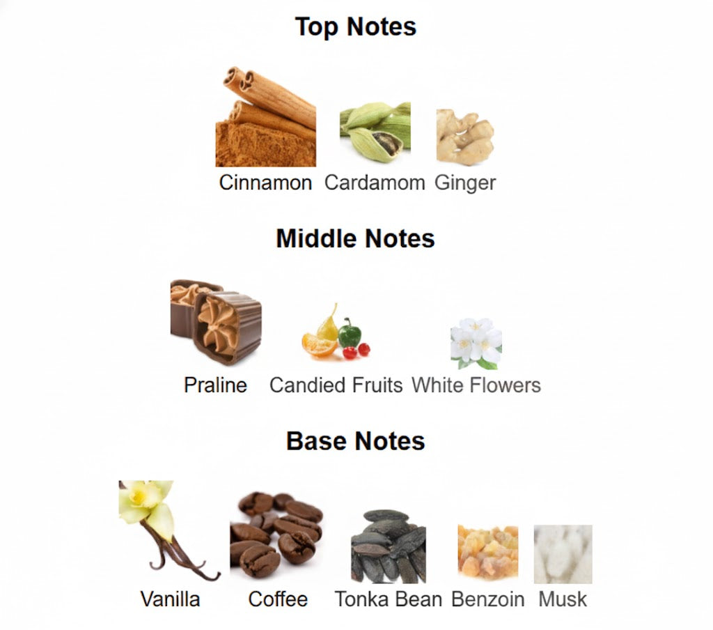 Scent Profile: Opens with a warm, aromatic intensity that immediately feels rich and inviting, highlighted by a pronounced coffee accord that adds depth and character. As it develops, sweet spices and creamy gourmand notes create a dense, comforting richness. The dry down is smooth, warm, and long-lasting, with a deep sweetness that feels opulent, cozy, and addictive.