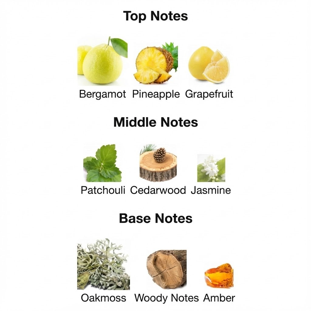 Fragrance Character: Fresh · Fruity · Woody · Amber · Masculine. Best for daily wear, social settings, and versatile day-to-night use. Ideal for spring, summer, and year-round wear for men who appreciate modern freshness supported by warm amber depth.